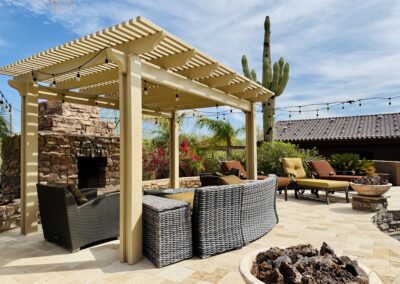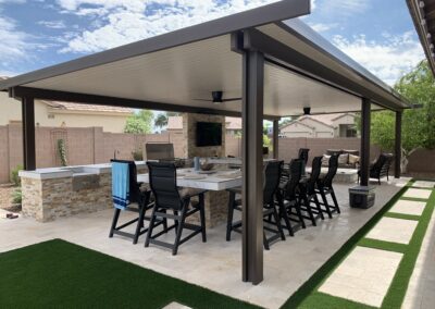 Project Description: Royal Covers built this Alumawood pergola with fans and lights Phoenix, Arizona over an outdoor kitchen / entertainment area.