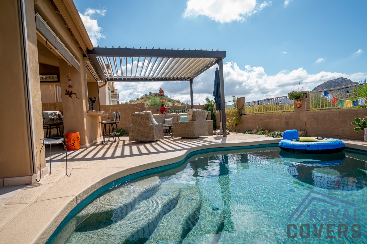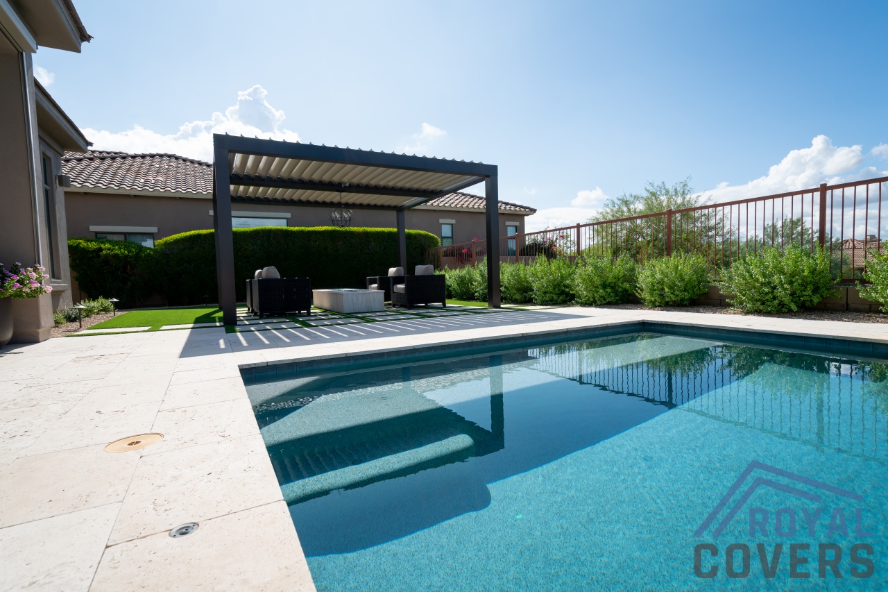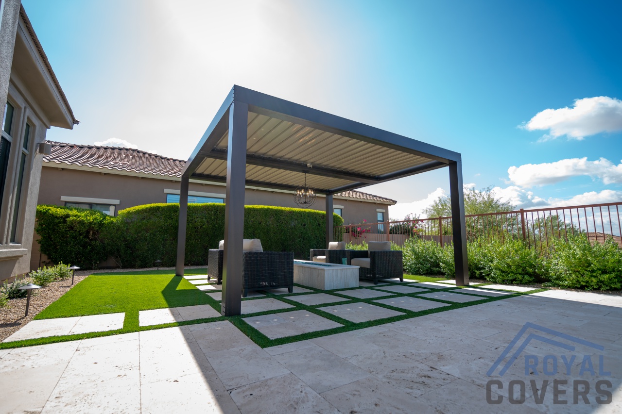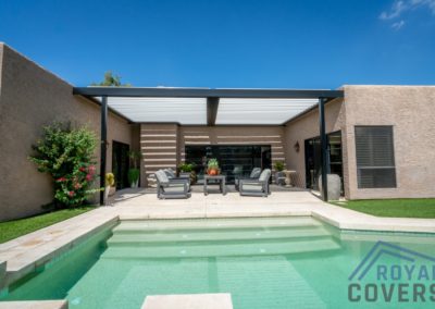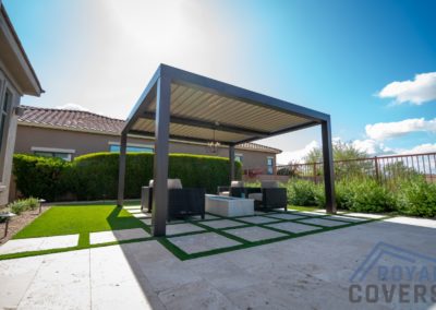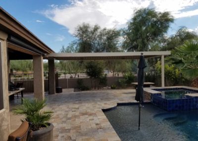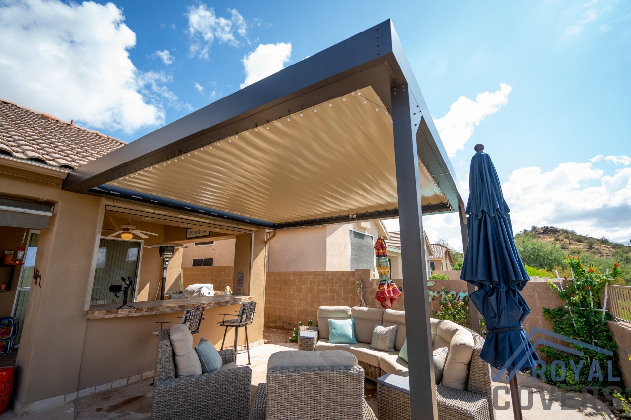 Project Description: Royal Covers built this Alumawood solid style freestanding pergola to provide a backyard entertainment area for this homeowner in Phoenix, Arizona. The Spanish Brown Framework with Desert Sand ceiling Alumawood material matches the home well and...