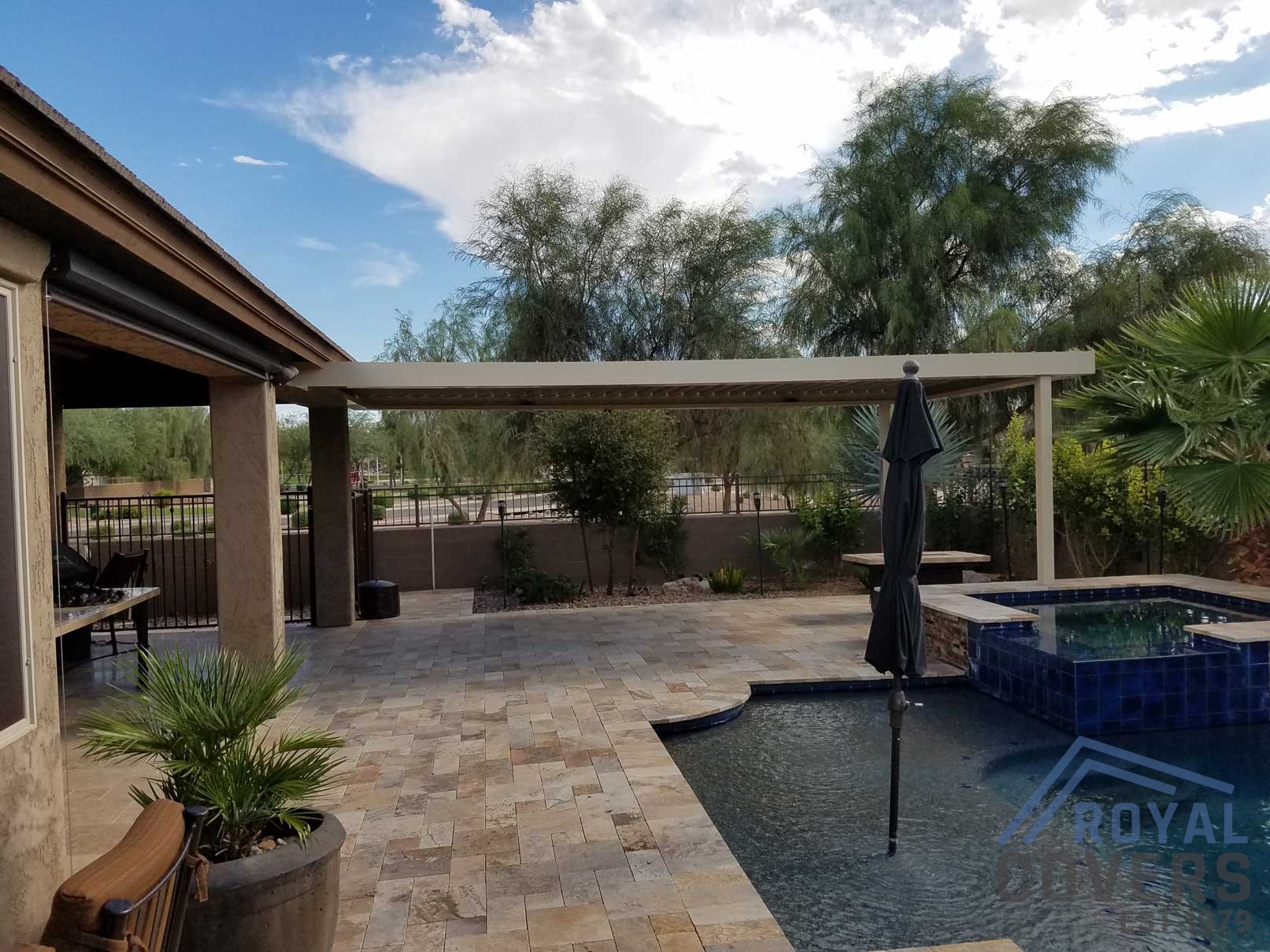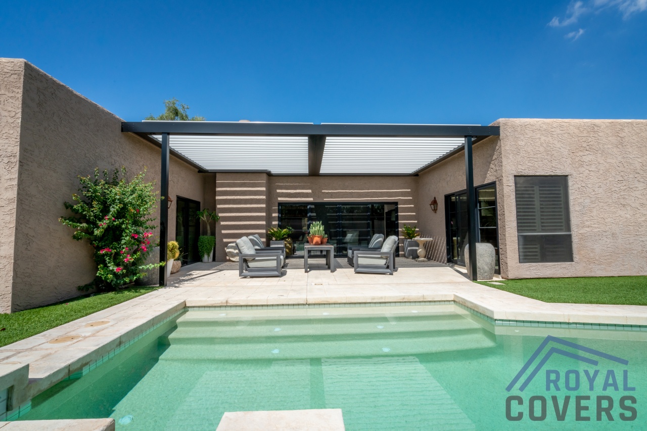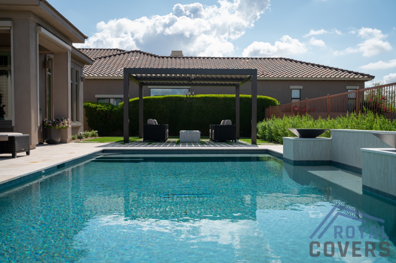 Project Description: Royal Covers built this Alumawood solid style freestanding pergola to provide a backyard entertainment area for this homeowner in Phoenix, Arizona. The Spanish Brown Framework with Desert Sand ceiling Alumawood material matches the home well and...