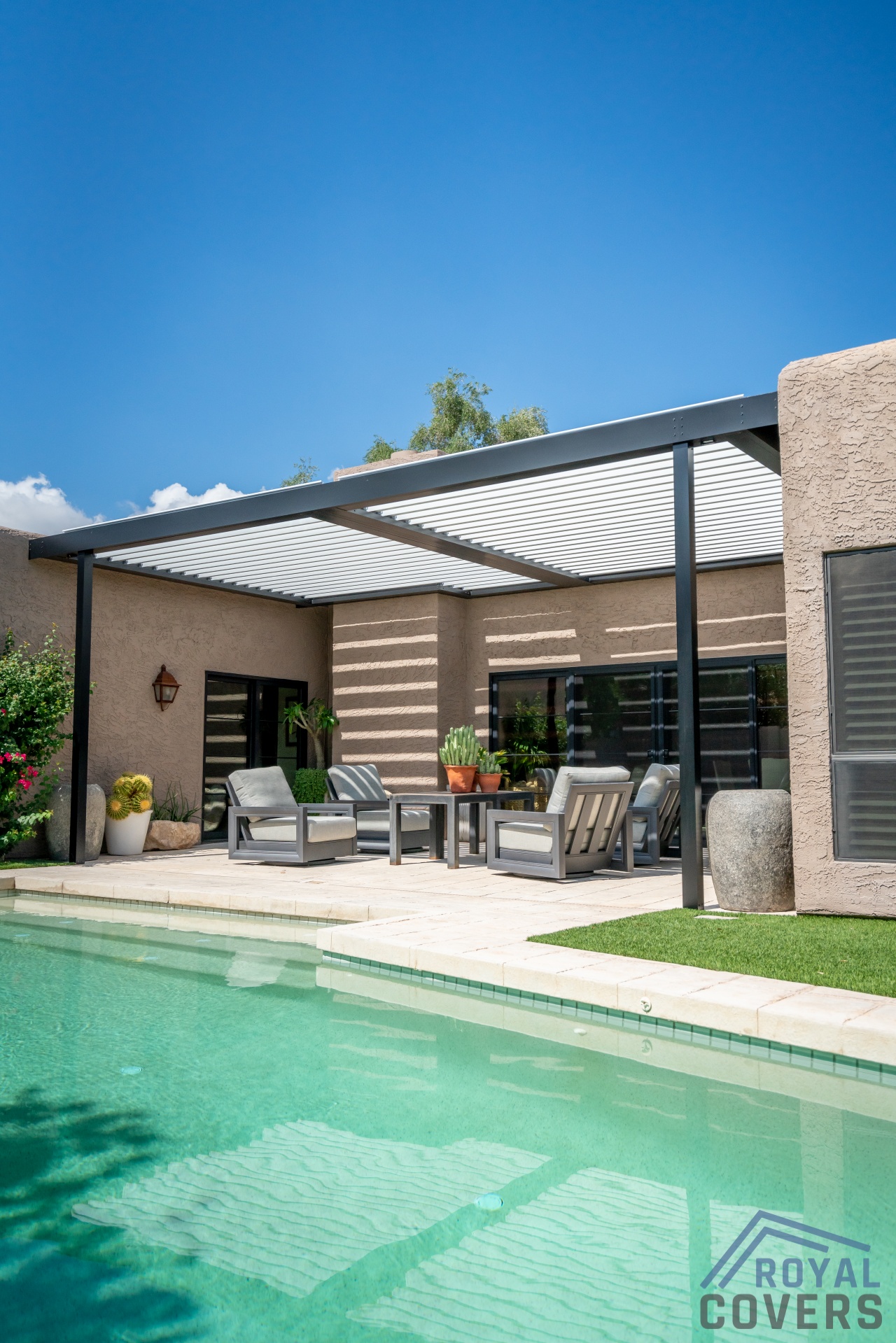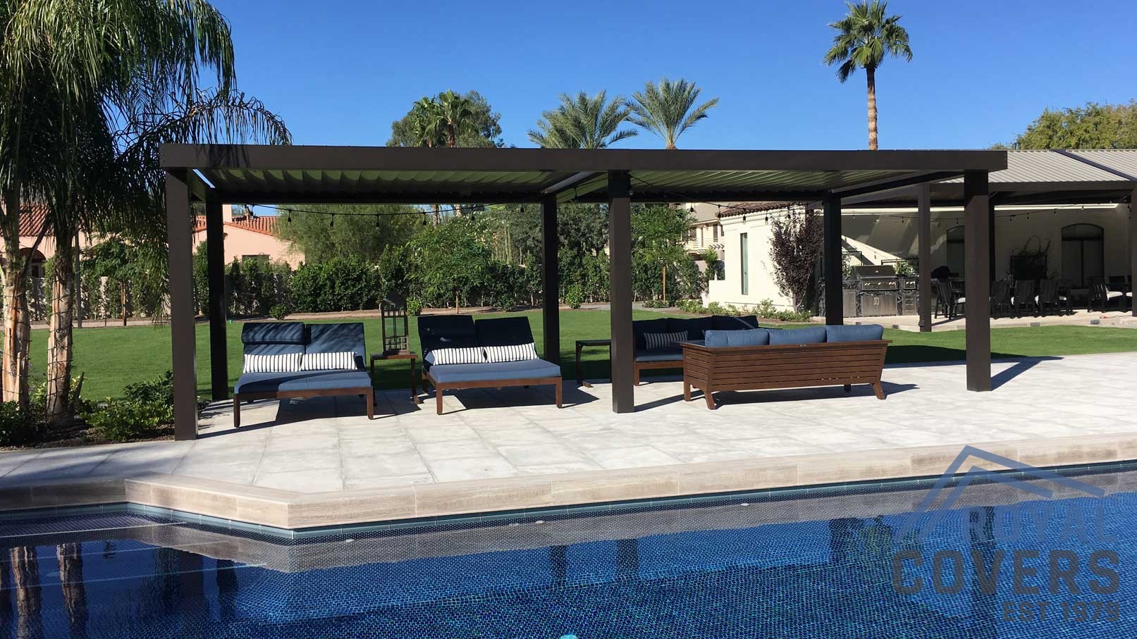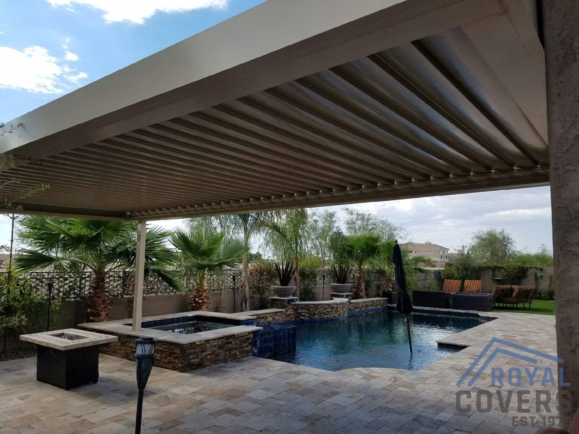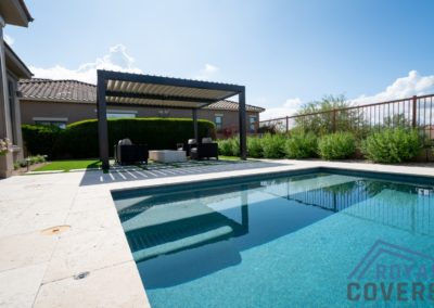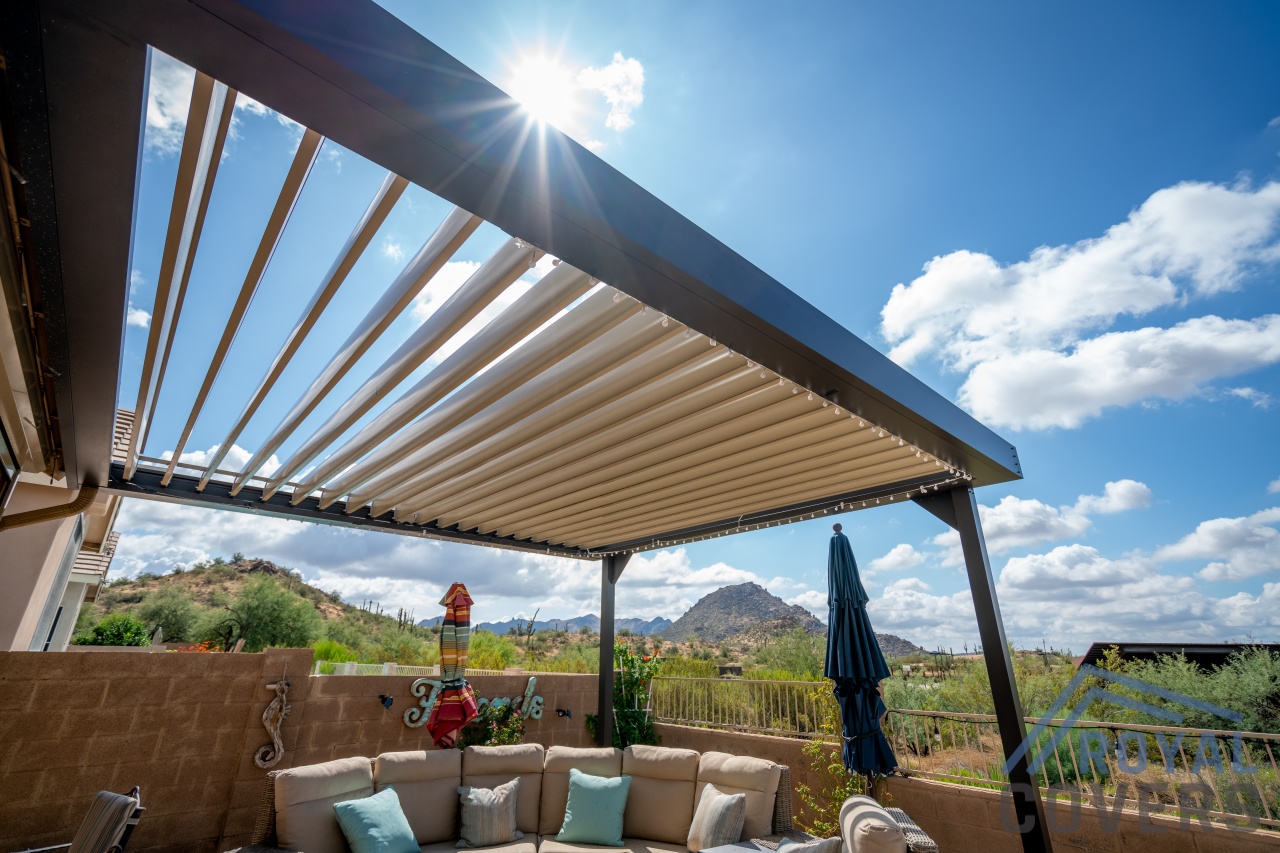 Project Description: Royal Covers built this Alumawood solid style freestanding pergola to provide a backyard entertainment area for this homeowner in Phoenix, Arizona. The Spanish Brown Framework with Desert Sand ceiling Alumawood material matches the home well and...